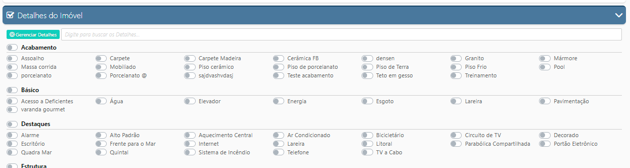 Aqui você pode selecionar os destaques já previamente cadastrados (acabamento, básico, estrutura, lazer, serviços próximos etc.), ou criar novos detalhes clicando no botão Gerenciar Detalhes.
