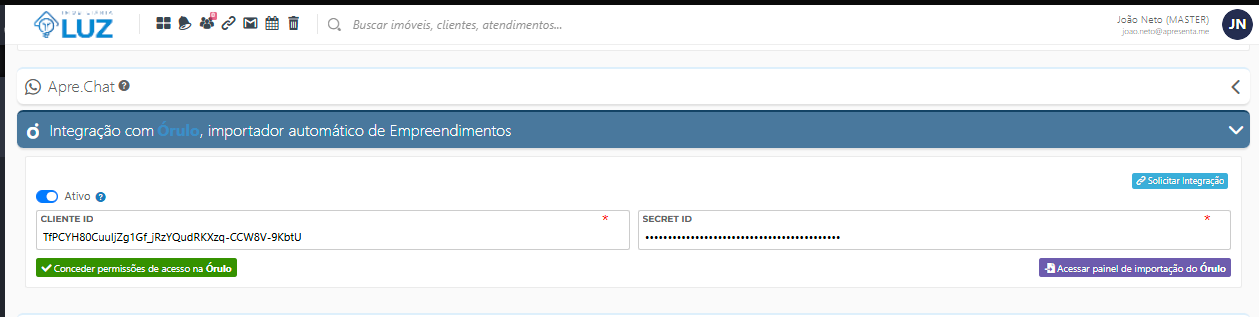 Após clicar aquidireciona vocêconcedeparaaautorizarÓruloo acessoparadafazer a integração e importar os imóveis.Solicitar Integração:Solicita integração Órulo>Apresenta.meparadentroimportardaos imóveis.