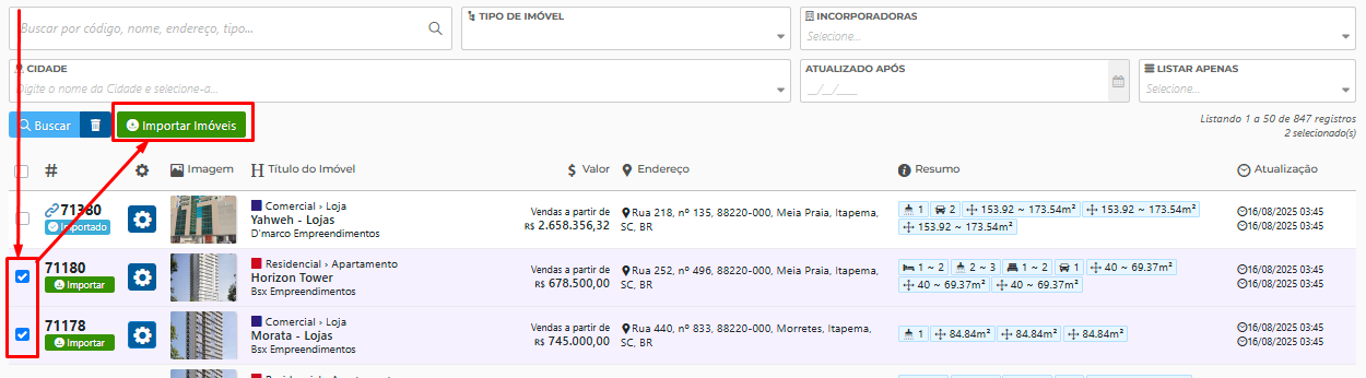 - Caso prefira, selecione múltiplos imóveis e clique em Importar Imóveis para realizar a importação em lote.