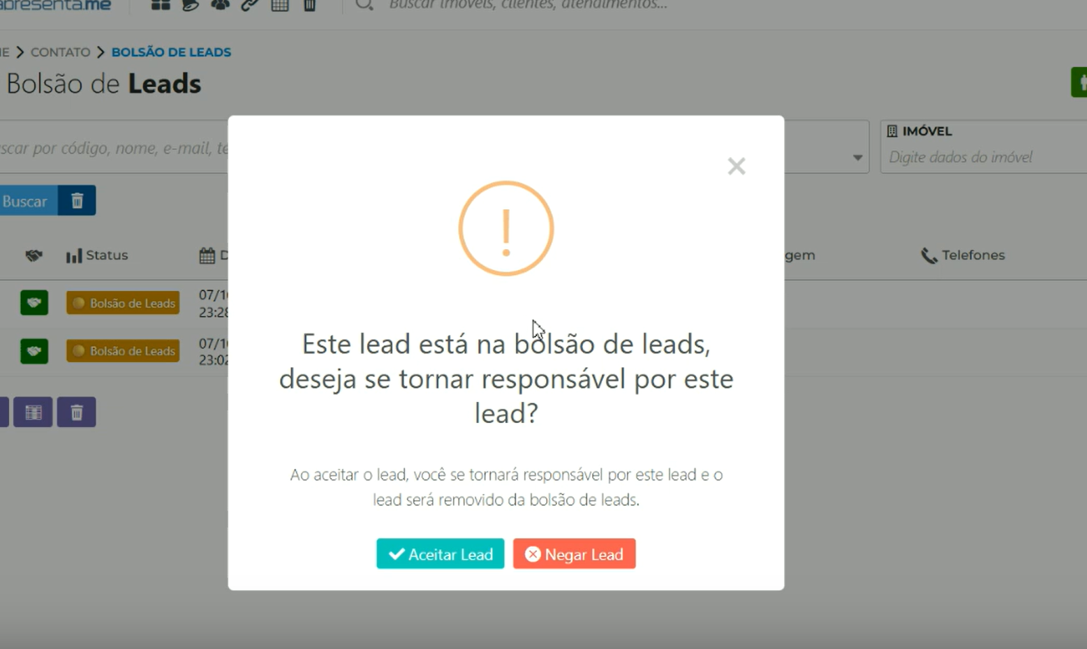 Para um corretor assumir um lead é necessário clicar no botão de negócios, após isso, o sistema trará uma mensagem informando que ele será o responsável pelo negócio que será criado a partir do lead selecionado.