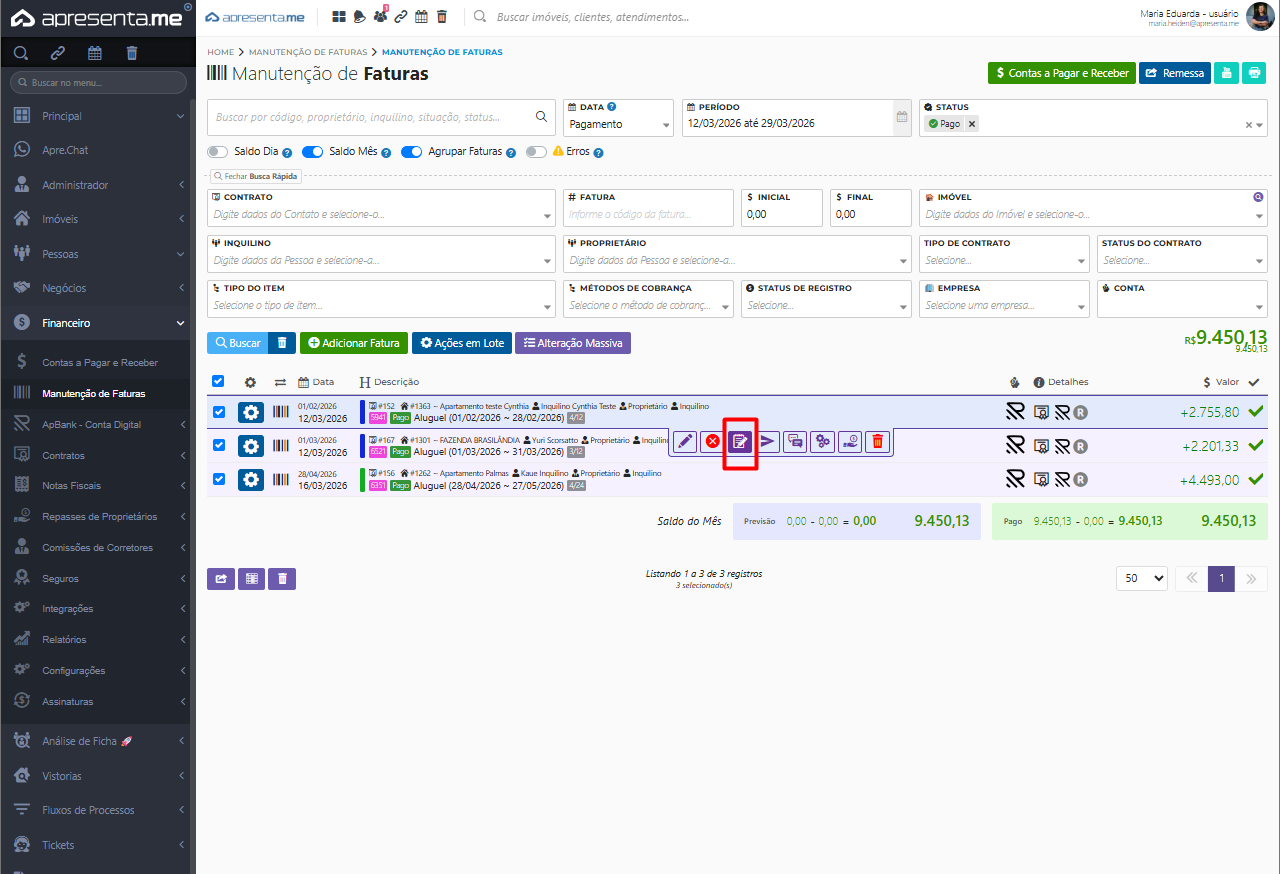 Acesse Financeiro > Manutenção de Faturas. Na listagem, localize a fatura com status Pago ou Recebido para a qual deseja emitir o recibo.