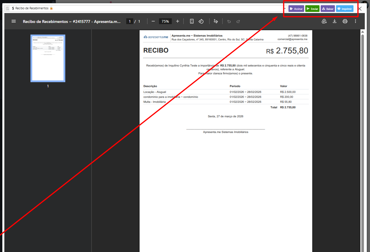 Assinar | Abre o fluxo de assinatura eletrônica do recibo. Permite solicitar assinaturas das partes envolvidas — por exemplo, do locatário — para formalizar o recebimento com validade jurídica. |