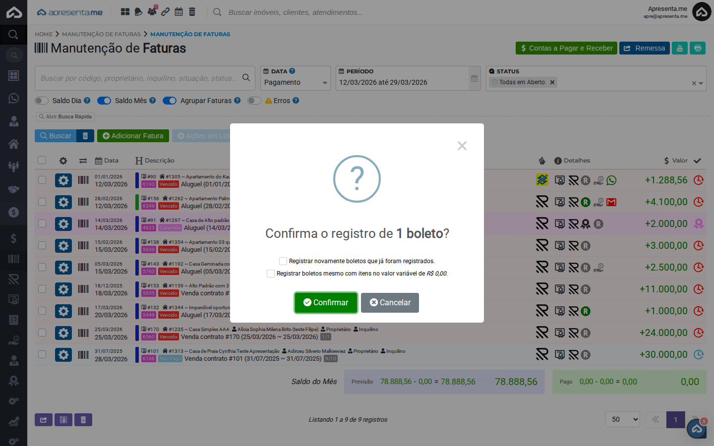 Uma janela de confirmação será exibida com a seguinte mensagem: "Confirma o registro de 1 boleto?"