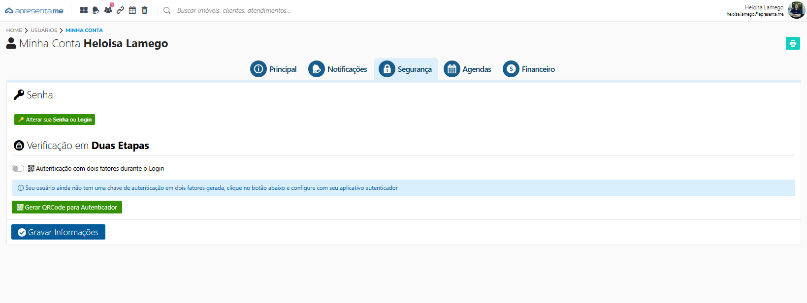 Quando ativado, o usuário passa a precisar do código do autenticador ao entrar no sistema.
