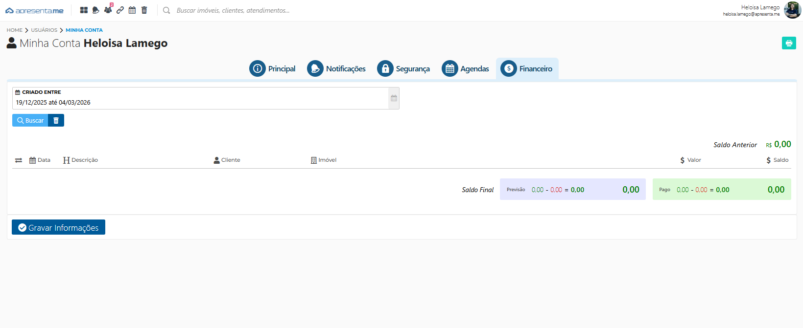 A aba Financeiro nas configurações da conta serve para que o usuário acompanhe e visualize o seu resumo financeiro individual dentro do sistema. Nela é possível: