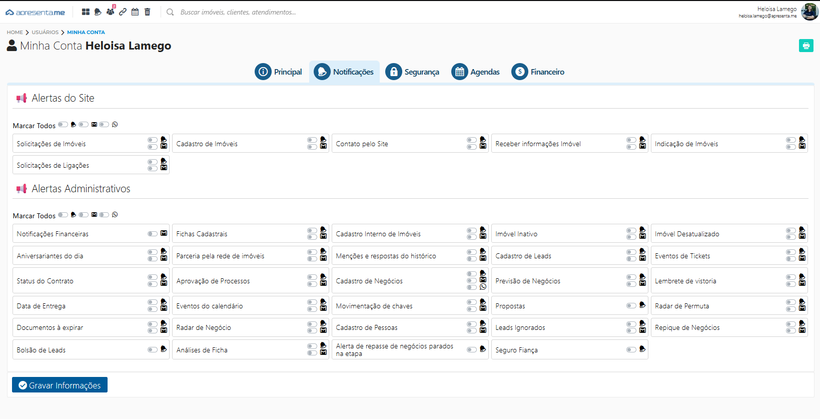 - Parceria pela rede de imóveis: Notificações de ações ligadas à rede/parcerias (quando esse módulo está em uso).