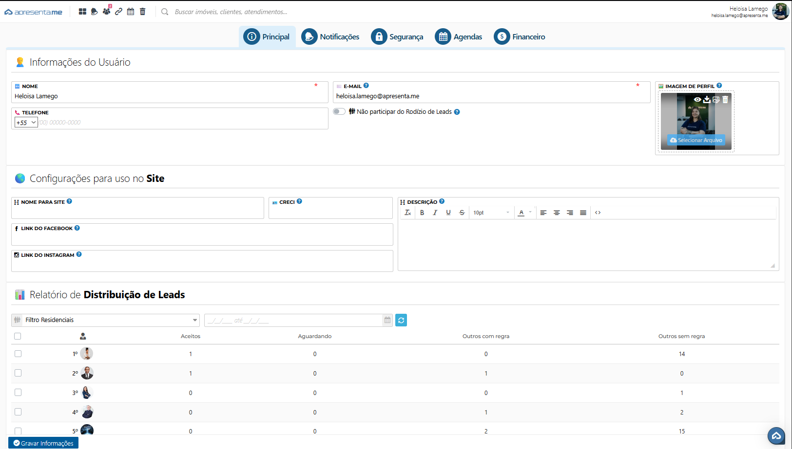 Esses campos são usados quando o site exibe informações do corretor/atendente responsável (perfil público/contato). Com isso, pode ser atualizado os seguintes dados: