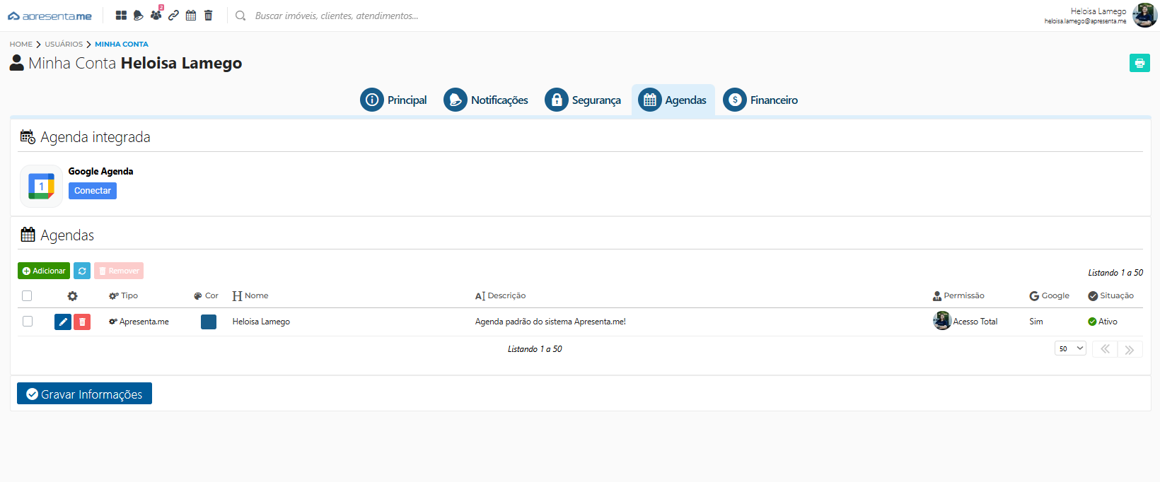Tipo: Indica o tipo/origem da agenda (ex.: “Apresenta.me”, agenda padrão do sistema).