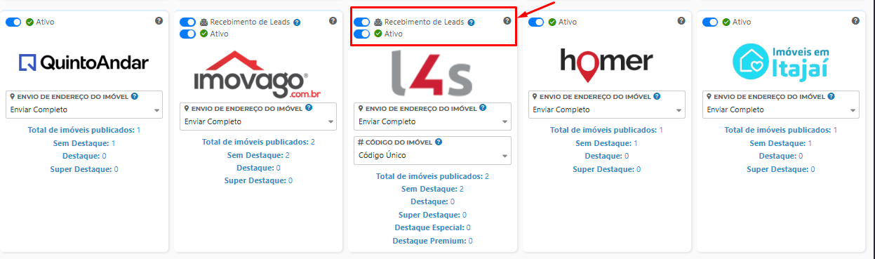 Somente os portais que estiverem com o status Ativo poderão receber imóveis publicados, seja individualmente ou em exportação em massa.