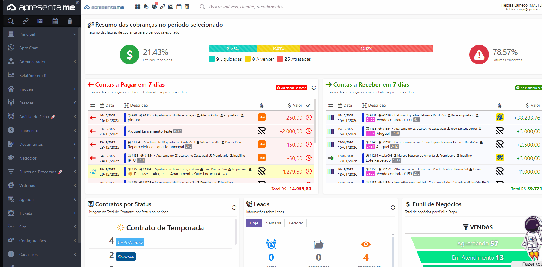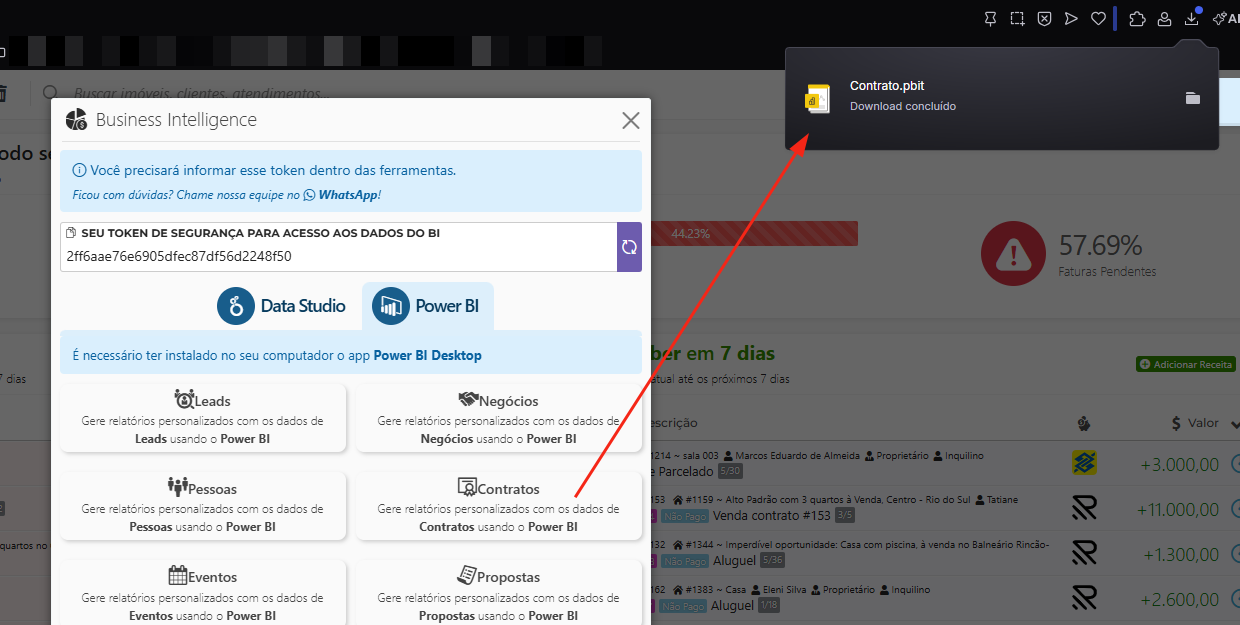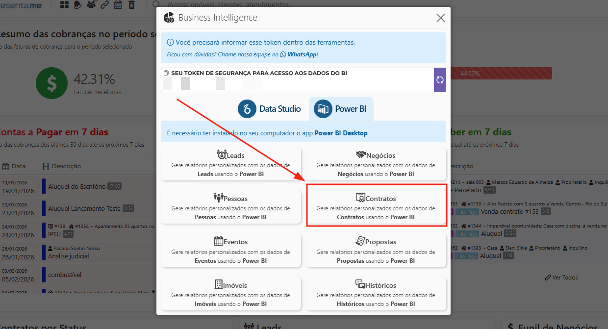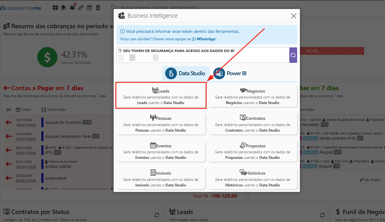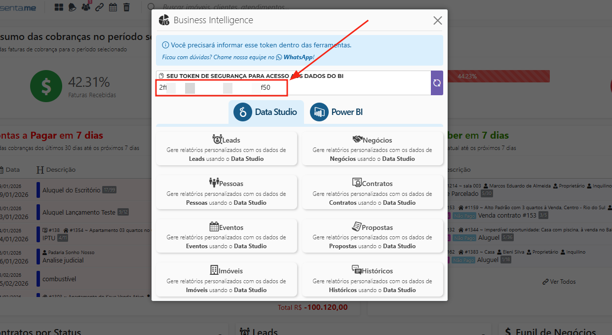 O módulo de Business Intelligence (BI) permite que a imobiliária crie relatórios personalizados a partir dos dados do sistema, integrando com ferramentas externas como Google Data Studio e Microsoft Power BI. Todos os relatórios são alimentados diretamente pelos dados do sistema (leads, negócios, pessoas, imóveis, contratos etc.), garantindo confiabilidade.