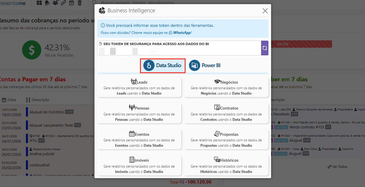 - Botões de Acesso: escolha entre Data Studio ou Power BI.