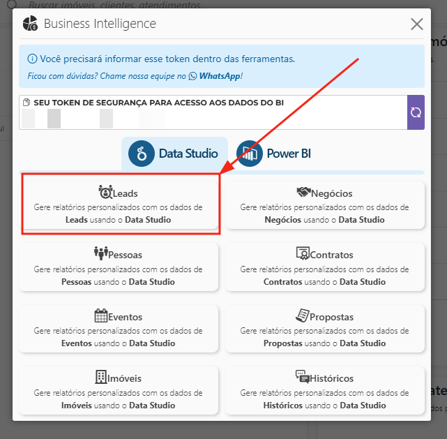 O módulo de Business Intelligence (BI) permite que a imobiliária crie relatórios personalizados a partir dos dados do sistema, integrando com ferramentas externas como Google Data Studio e Microsoft Power BI. Todos os relatórios são alimentados diretamente pelos dados do sistema (leads, negócios, pessoas, imóveis, contratos etc.), garantindo confiabilidade.