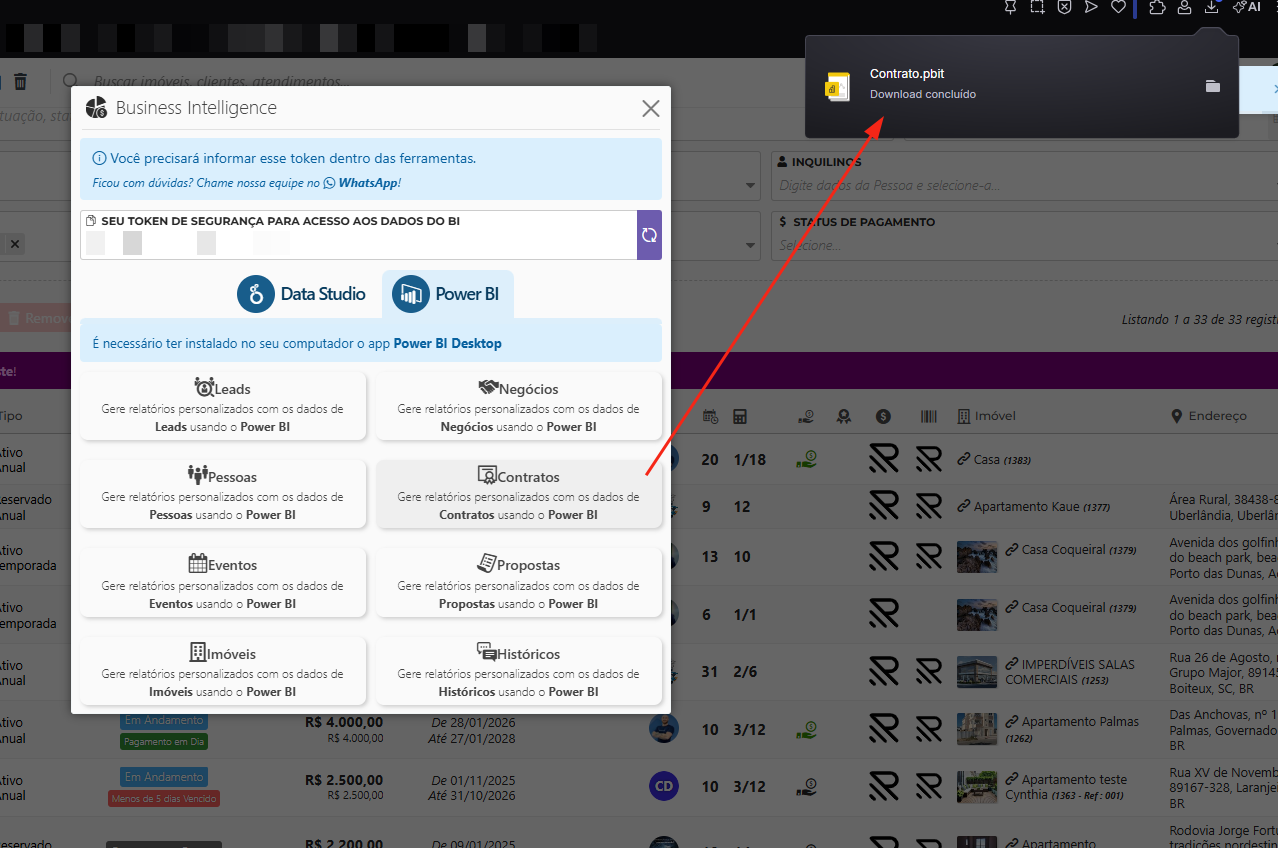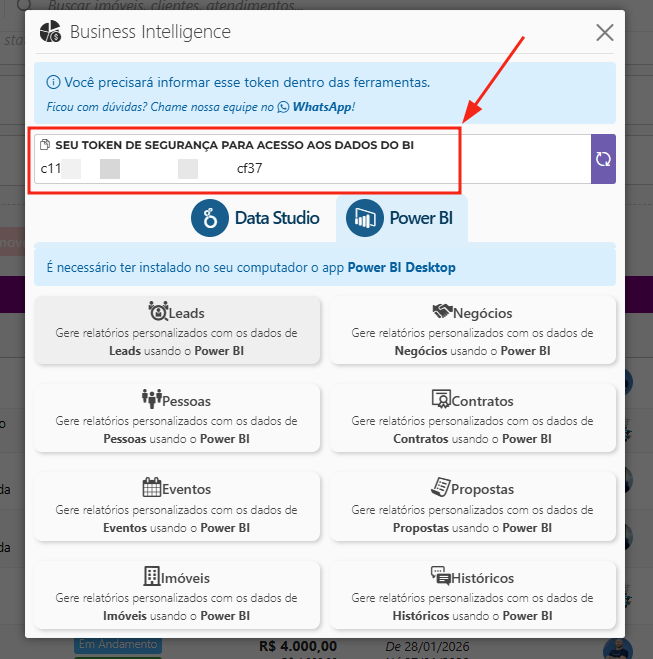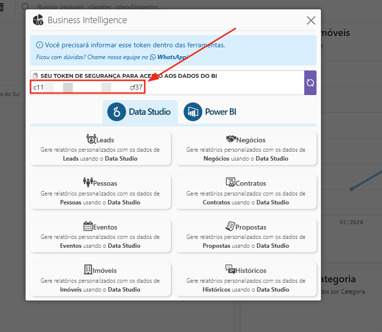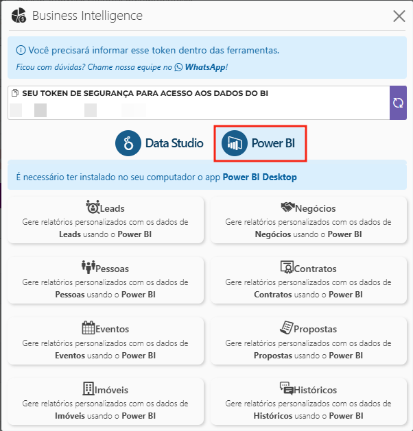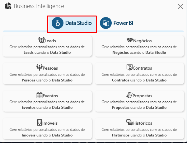 O módulo de Business Intelligence (BI) permite que a imobiliária crie relatórios personalizados a partir dos dados do sistema, integrando com ferramentas externas como Google Data Studio e Microsoft Power BI. Todos os relatórios são alimentados diretamente pelos dados do sistema (leads, negócios, pessoas, imóveis, contratos etc.), garantindo confiabilidade.