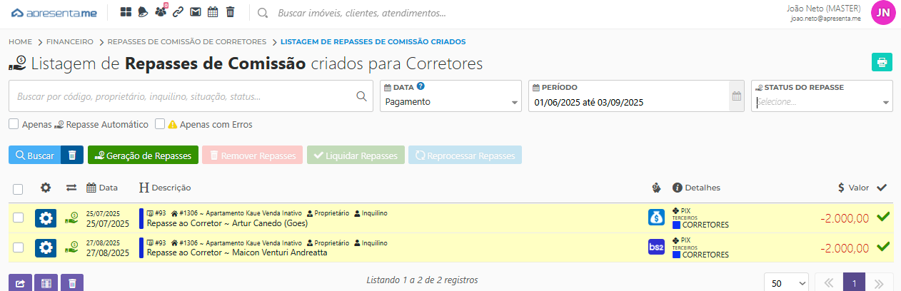 👉 Assim, para ver repasses criados basta abrir a listagem.