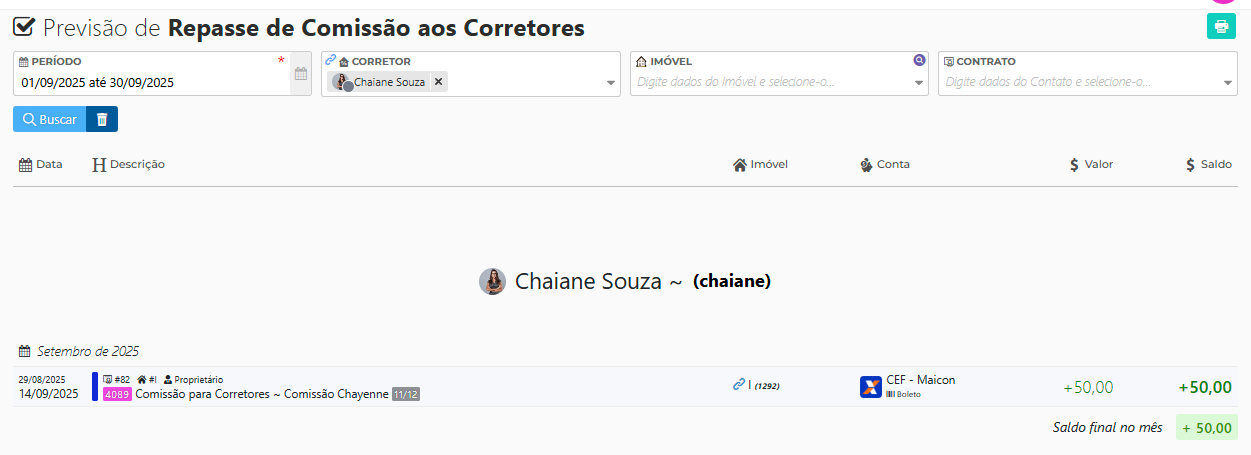 Neste exemplo abaixo vemos que a corretora Chaiane tem a receber R$50,00 de uma comissão:
